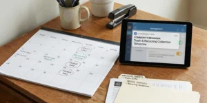 Calendars guide behavior. Post an annual schedule with collection changes, bulky pickups, and hazardous drop-off days. Add storm reminders when rain or wind may disrupt service.
